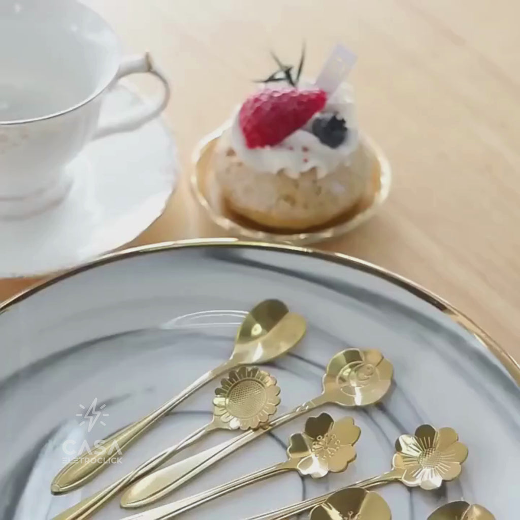 Cada colher traz um design floral exclusivo, tornando o café ou o bolo um momento ainda mais elegante.